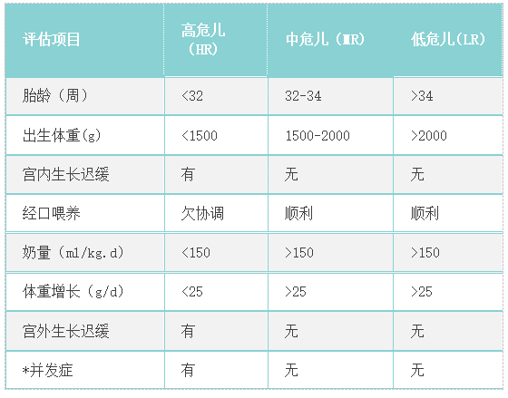 可以对照下表,看看早产宝宝符合是早产儿中的高危儿、中危儿还是低危儿。