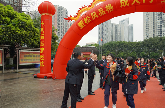 3月18日,重庆市松树桥中学举行一场别开生面的成人礼暨高考倒计时活动。松中少年集体表白,将对父母、教师爱意大声宣之于口。沐浴在爱中,这群学生在家长、教师的陪同下,共同踏上高考的征途,奔赴美好明天。