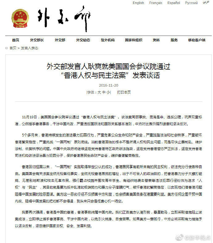 11月19日,美国国会参议院审议通过“香港人权与民主法案”。该法案罔顾事实、混淆是非、违反公理,玩弄双重标准,公然插手香港事务,干涉中国内政,严重违反国际法和国际关系基本准则,中方对此表示强烈谴责和坚决反对。