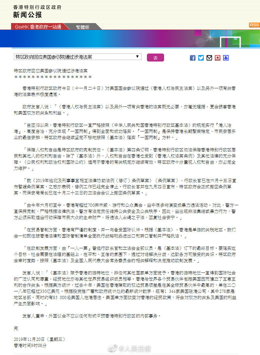 香港特别行政区政府今日(十一月二十日)对美国国会参议院通过《香港人权与民主法案》以及另外一项有关香港的法案表示极度遗憾。