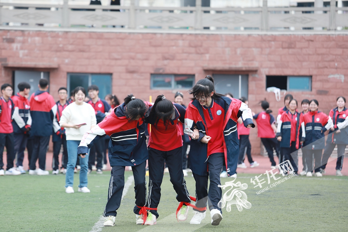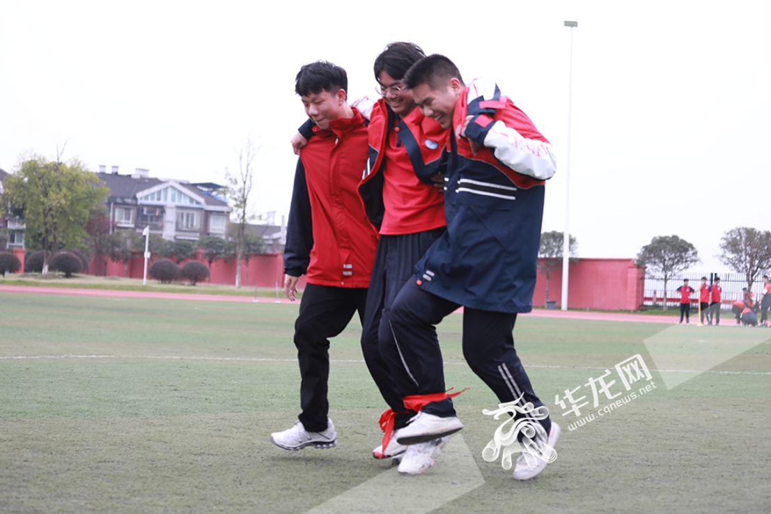 紧接着来到第一个环节——齐心协力向未来。八个班分别选出24名同学,三人一组形成八个小组,每组三名成员并肩站立,内侧腿系好绳子,形成“三人四足”,各班的第一组从起点到对面的立杆处与下一组进行接力,第二组成员迅速绑上绳子并跑向起点,同学们在你追我赶间增强了团队协作意识。