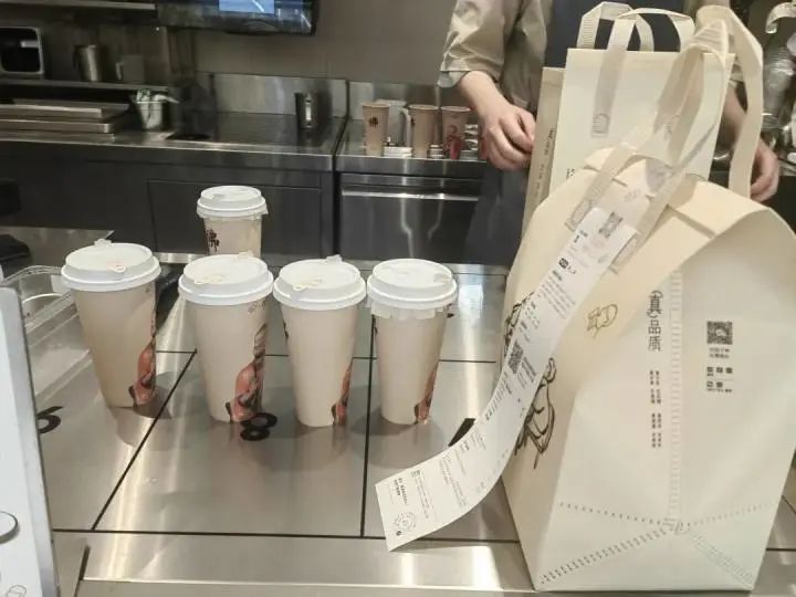 早上10点,记者在小程序上点了“佛喜茶拿铁·周边套餐”,选了沉思罗汉(无语佛)的冰箱贴,到达门店时,吧台上已经有四五杯佛喜茶拿铁了,还有好几个佛喜茶拿铁的外卖袋子,后面的制作台上有一排的同款饮品正在制作。
