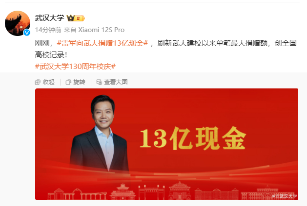 “从26年前首次向母校捐赠开始的还愿之旅,今天终于达成了心愿”,雷军表示,在他和众多校友的心目中,武大就是全球最好的大学,为了让武大越来越好,每个人都可以用实际行动回馈母校。他特别表示,关于捐款从来不主张攀比。武大130周年校庆,很多校友都积极捐款。每一份捐款都是校友对母校的爱,分量都一样重。他还表示,此前捐赠教学楼的时候,他就提出要比校友陈东升少捐一块钱,所以捐了一亿少一块。这次130周年校庆,捐赠13亿现金,也是和陈东升校友商量过,并得到支持,向母校130年校庆献礼。
