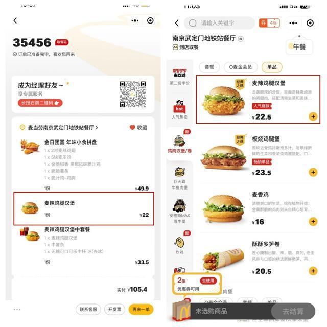 “气人!麦辣鸡腿堡涨了5毛钱!”南京市民马先生是麦当劳的忠实用户,“一大早看到热搜上麦当劳要涨价,我就打开App看了一下,发现我经常点的麦辣鸡腿堡果然涨价了。”他给现代快报记者看了订单截图,今年1月初他在麦当劳武定门地铁站餐厅购买了麦辣鸡腿堡,当时的价格是22元一个,现在是22.5元一个。“还好之前囤了一些券包,可以晚点再承受涨价的痛。虽然这个涨幅只有2.5%,但这不是麦当劳今年第一次涨价了。”