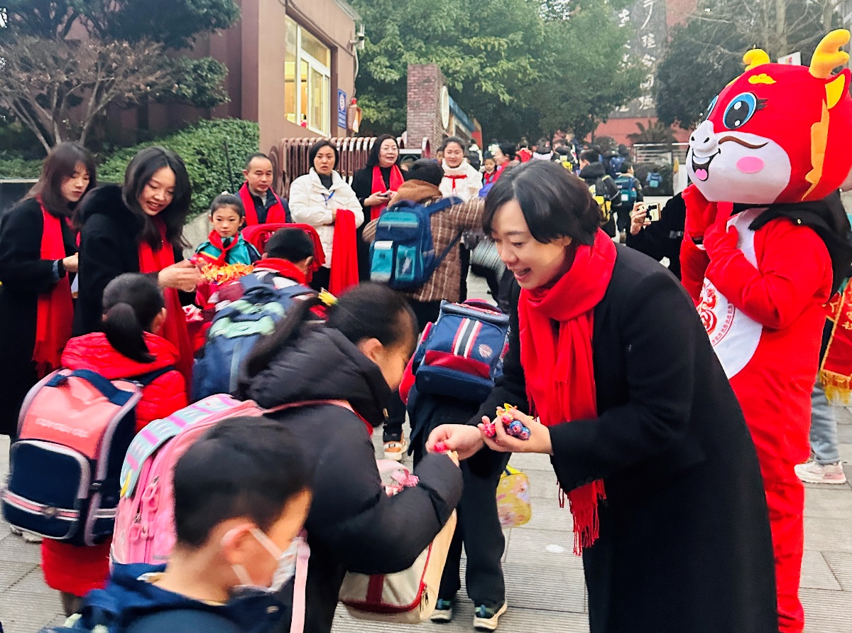 清晨,人和小学党支部书记、校长杨敏带领全体行政人员来到校门口,向全校师生送上了新年的祝福。老师们戴上了寓意着吉祥如意的新年红围巾,手捧龙年定制的糖果,送给每一位孩子新年的专属甜蜜和幸福。
