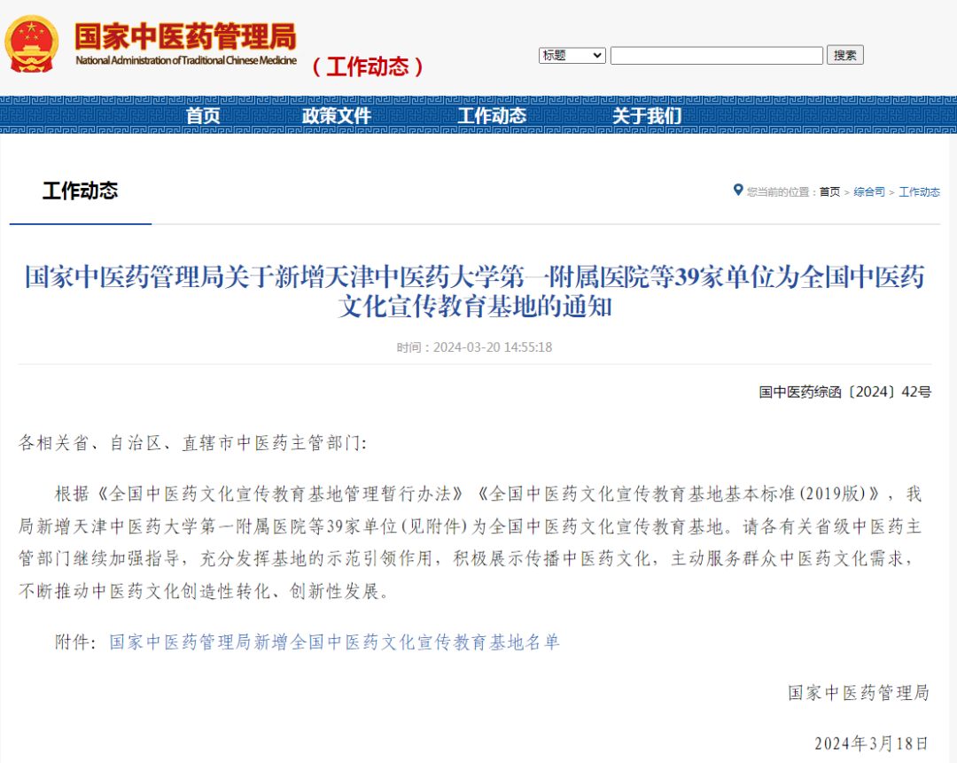 近日,国家中医药管理局下发《关于新增天津中医药大学第一附属医院等39家单位为全国中医药文化宣传教育基地的通知》文件,潼南区中医院获国家中医药管理局批准,成为全国中医药文化宣传教育基地。