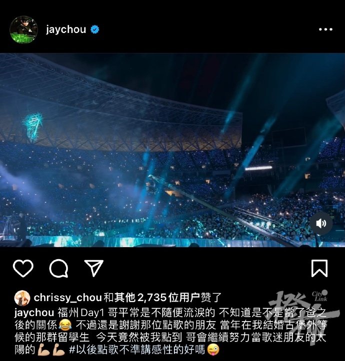 值得一提的是,演唱会后,周杰伦发文回应称:“哥平常是不随便流泪的 不知道是不是当了爸之后的关系 不过还是谢谢那位点歌的朋友当年在我结婚古堡外等候的那群留学生 今天竟然被我点到 哥会继续努力当歌迷朋友的太阳的”
