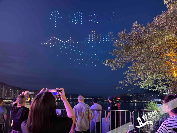 当天晚上,还有800架无人机“漫步”夜空,时而变换成“魅力母城”“平湖之夜”的字样,时而展示着万州的本土文化……传统与现代元素交汇在长江畔的上空,为观众带来了一场精彩的视觉盛宴。大家一边拿着手机拍摄记录,一边惊叹无人机表演的魅力,精彩的表演点亮了群众家门口的文化夜生活。