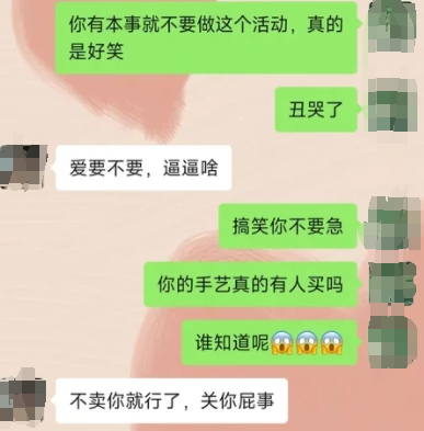 宋女士通过平台与这家名为“朝暮里花艺馆”的商家沟通,并且添加了商家的微信。希望商家能够退款,商家一开始解释店里一个人插花忙不赢,但花没有问题。后双方在言语上相互攻击,冲突升级。宋女士说:“你有本事就不要做这个活动”,并评价收到的花“丑哭了”,而商家也嘲讽宋女士“爱要不要,逼逼啥。”“不卖你就行了,关你屁事。”
