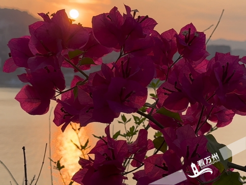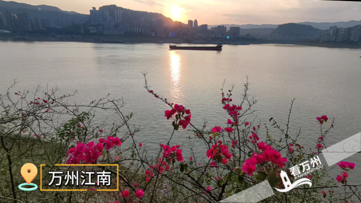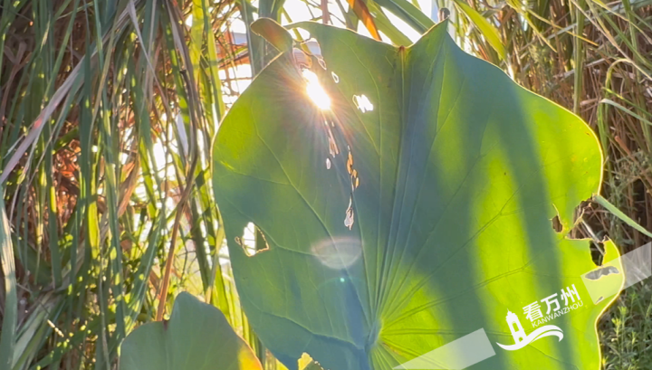 傍晚时分,天边一轮红日慢慢西坠,染红了万州的江面和环湖新一茬开放的三角梅,太阳余晖穿透渐残的荷叶,带来无限诗意和美好。