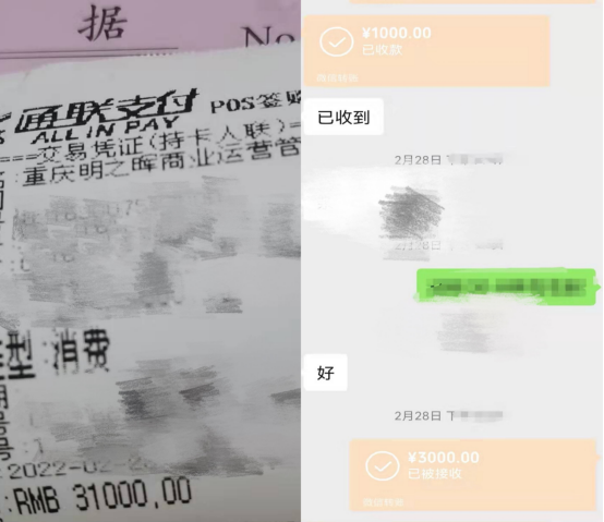 这35000元,分别以两种方式支出:4000元直接转给了销售人员,一次1000,一次3000,为车位定金;剩余的31000元,则刷给了该销售公司。