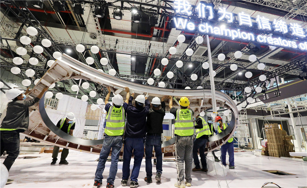 10月29日,施工人员在第四届进博会展馆内搭建展台。新华社记者 方喆 摄
