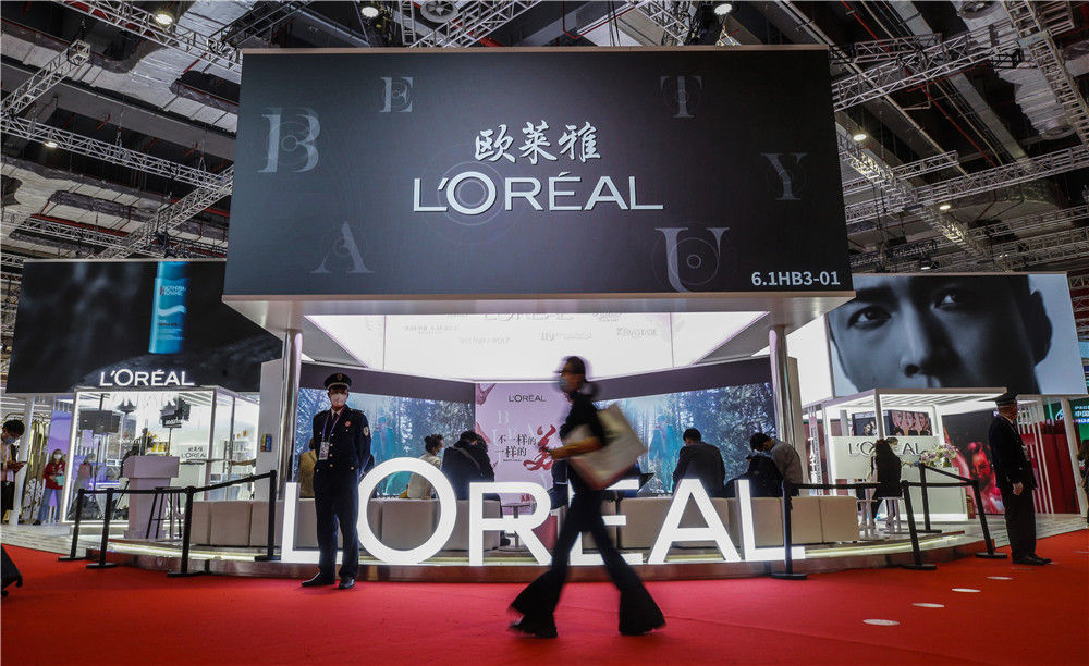 2020年11月7日,参观者走过第三届中国国际进口博览会消费品展区的欧莱雅展台。新华社记者 张玉薇 摄