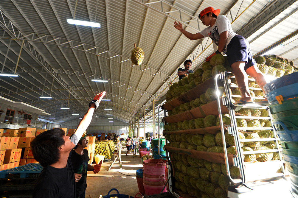 2020年5月20日,在泰国庄他武里府,果农运送新采摘的榴莲。突如其来的新冠疫情令当地果农感受到了巨大的威胁。但是,中国市场的强劲需求帮助泰国果农渡过疫情难关。新华社发(拉亨 摄)