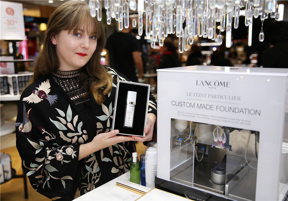 2019年10月25日,在法国巴黎,一名顾客展示欧莱雅集团的美妆黑科技产品:兰蔻定制粉底液。该产品曾连续在进博会上展出。新华社记者 高静 摄