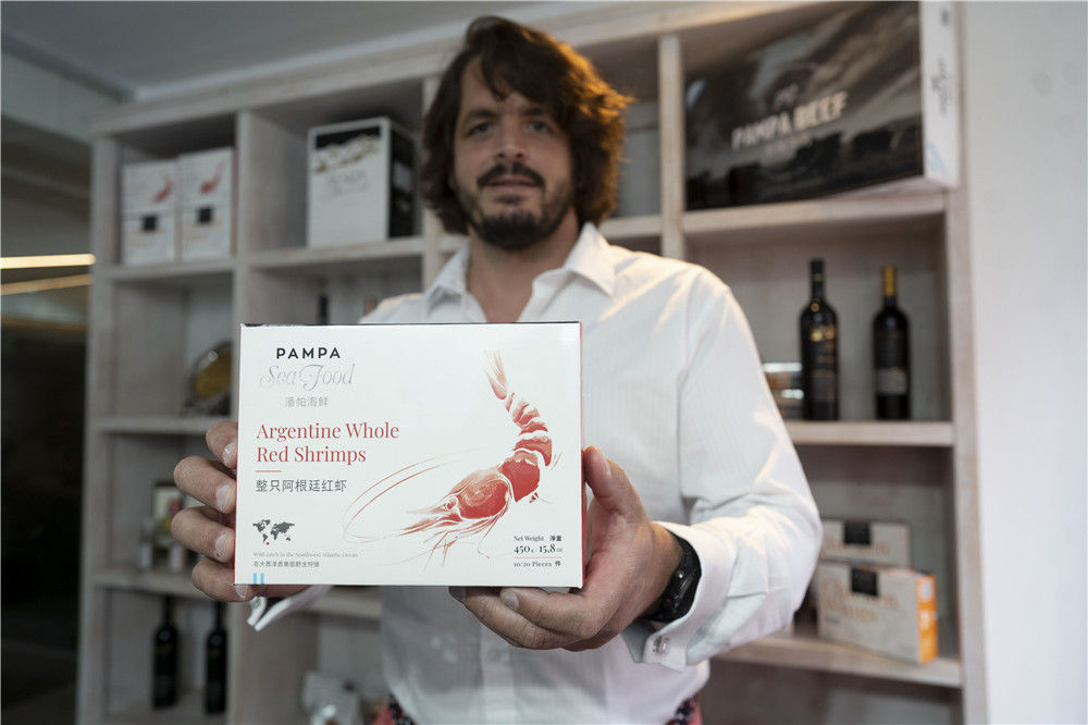 2020年11月6日,在阿根廷布宜诺斯艾利斯,工作人员展示跨境电商平台潘帕市场出口中国的红虾。新华社发(马丁·萨巴拉摄)