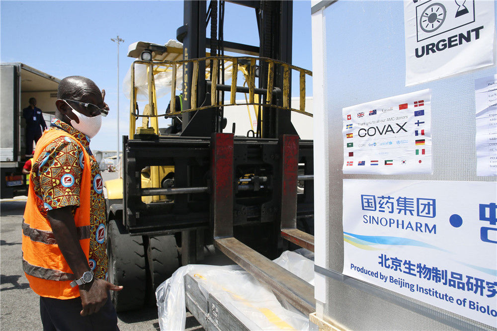 2021年9月18日,工作人员在科特迪瓦阿比让国际机场搬运中国国药集团通过“新冠疫苗实施计划”供应科特迪瓦的新冠疫苗。新华社发(伊万·宋摄)